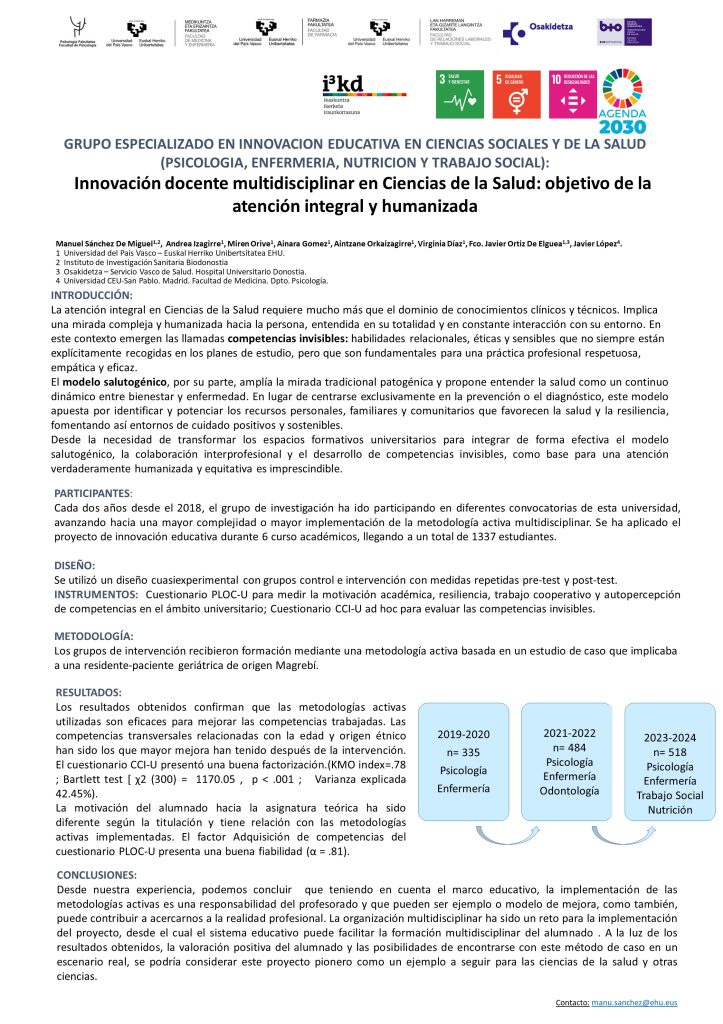 Se ha trabajado multidisciplinarmente, con 3 metodologías activas (método de caso, aprendizaje basado en retos y la utilización de la historia clínica electrónica). Se han validado dos cuestionarios (CCI-U para la evaluar las competencias invisibles relacionadas con la edad, género, origen étnico-cultural y estado emocional y PLOC-U para la motivación intrínseca del estudiantado).