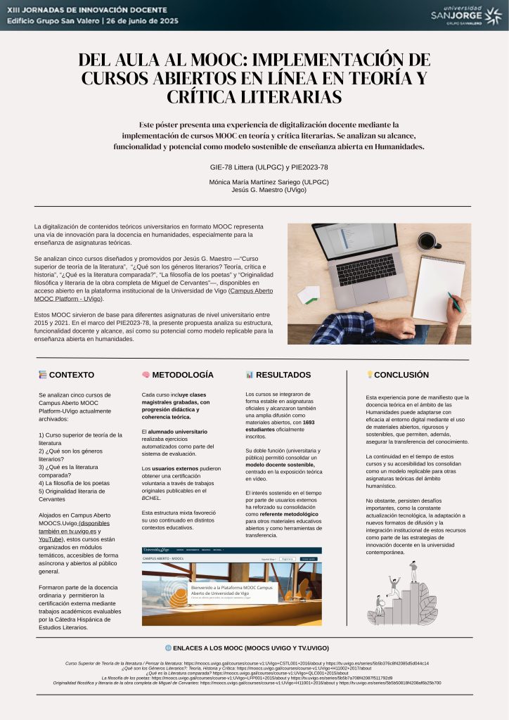 Esta propuesta presenta una experiencia concreta de innovación educativa basada en el diseño, implementación y evaluación de cursos masivos abiertos en línea (MOOC) aplicados a la docencia universitaria en teoría y crítica literarias. Se analizan cuatro cursos creados por Jesús G. Maestro —“Curso superior de teoría de la literatura”, “Originalidad literaria de Cervantes”, “¿Qué es la literatura comparada?” y “La filosofía de los poetas”—, disponibles en la plataforma institucional de la Universidad de Vigo y en YouTube. En el marco del proyecto de innovación educativa PIE2023-78 (ULPGC), se ha analizado tanto su integración en entornos académicos oficiales como su aprovechamiento externo con fines de autoformación y certificación. La propuesta examina la estructura didáctica de estos cuatro cursos, su sostenibilidad como recurso docente y su potencial como modelo replicable para la enseñanza abierta y la transferencia del conocimiento en humanidades.